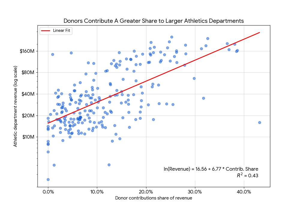 So a strong link between athletics and donor affinity seems plausible. And as former (highly successful) fundraisers, Jay and David can say that many conversations with high-end donors were organized around athletics. Further, if we look back at the USA Today athletics financial data that we discussed last week, there is a strong correlation between the size (revenue) of the athletics department and the share of donor contributions in overall athletics revenues.